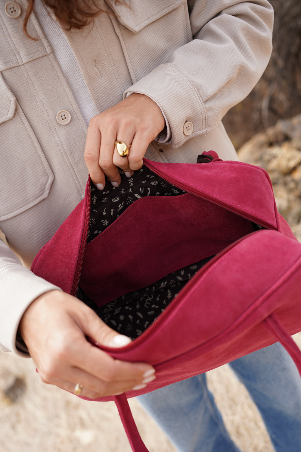 Bezpieczne użytkowanie: unikaj kontaktu z wodą i tłustymi substancjami. Nie pierz zamszowych produktów w pralce, nie czyść chemicznie ani nie stosuj preparatów do skór licowych – mogą uszkodzić strukturę zamszu. Chroń produkt przed ostrymi i chropowatymi powierzchniami, nie przygniataj go.