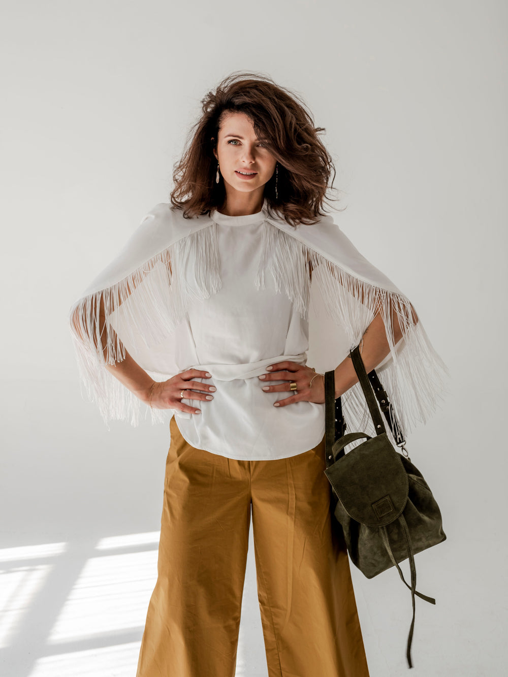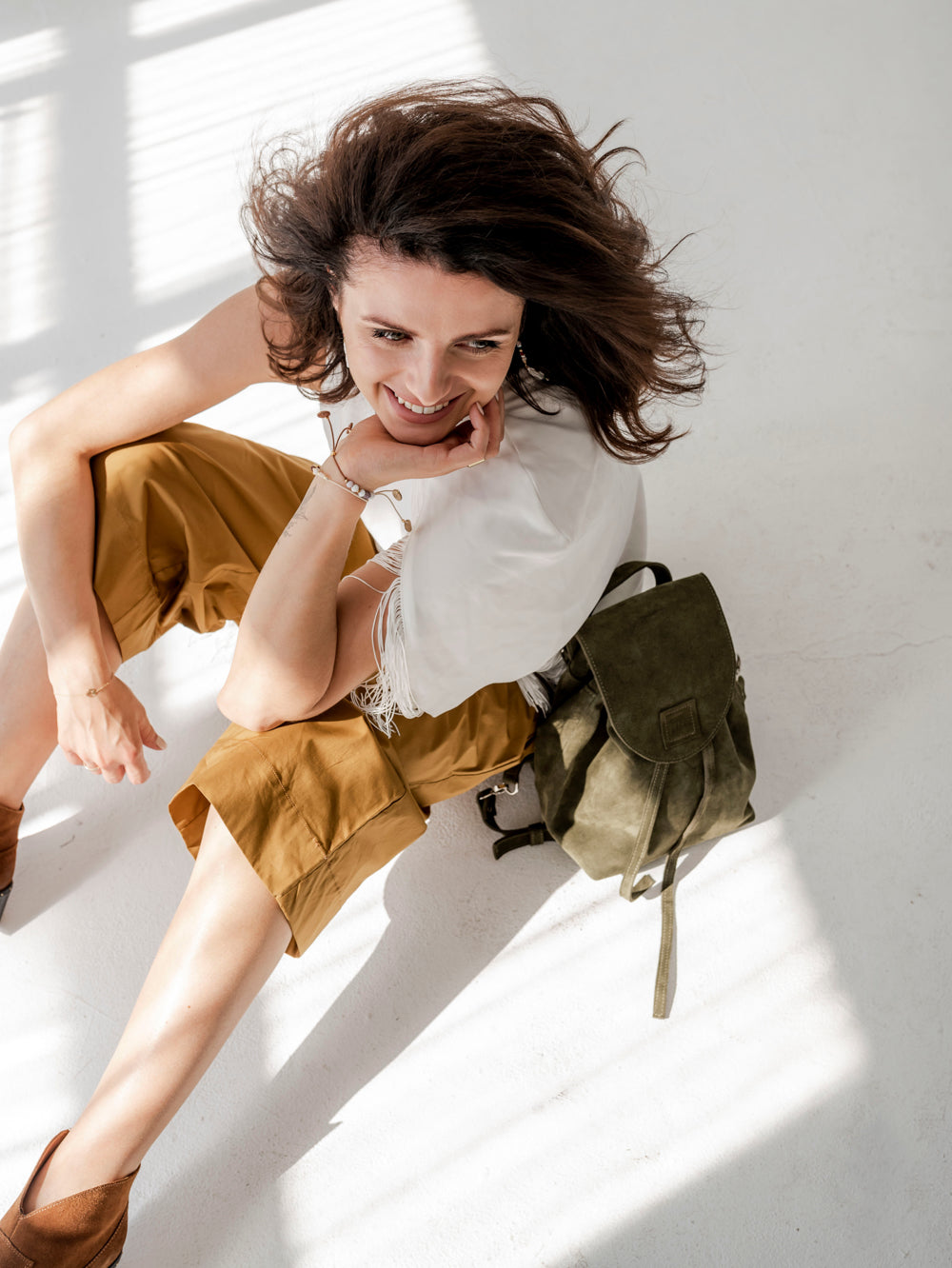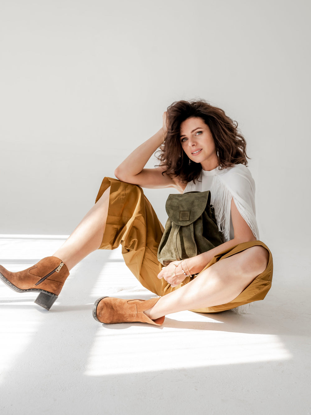 Pięknie układa się na plecach, nie dominuje sylwetki, a wręcz podkreśla jej lekkość. Dzięki szerokim, 2-centymetrowym ramiączkom, które można regulować za pomocą klamer noszenie go to czysta przyjemność. Ten model został uszyty z naturalnego zamszu – wyjątkowo miękkiego i przyjemnego w dotyku. Każdy jego element jest ręcznie wycinany, a następnie starannie zszywany – to proces wymagający uwagi i zaangażowania, ale efektem jest produkt z duszą, który zostaje z Tobą na lata.