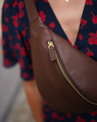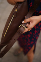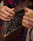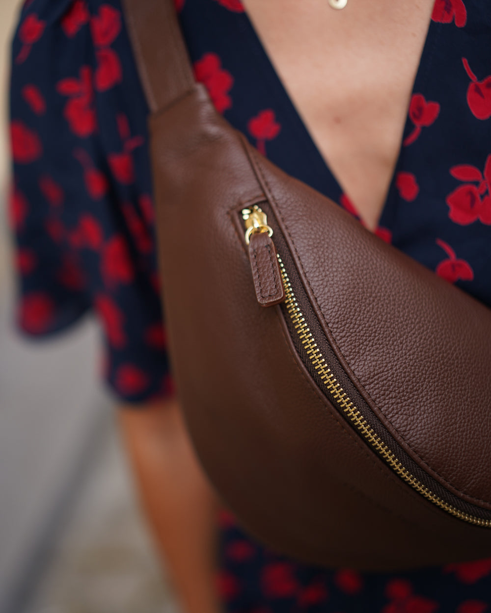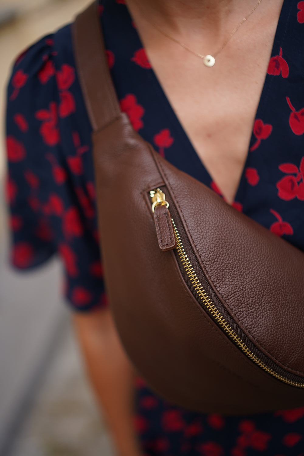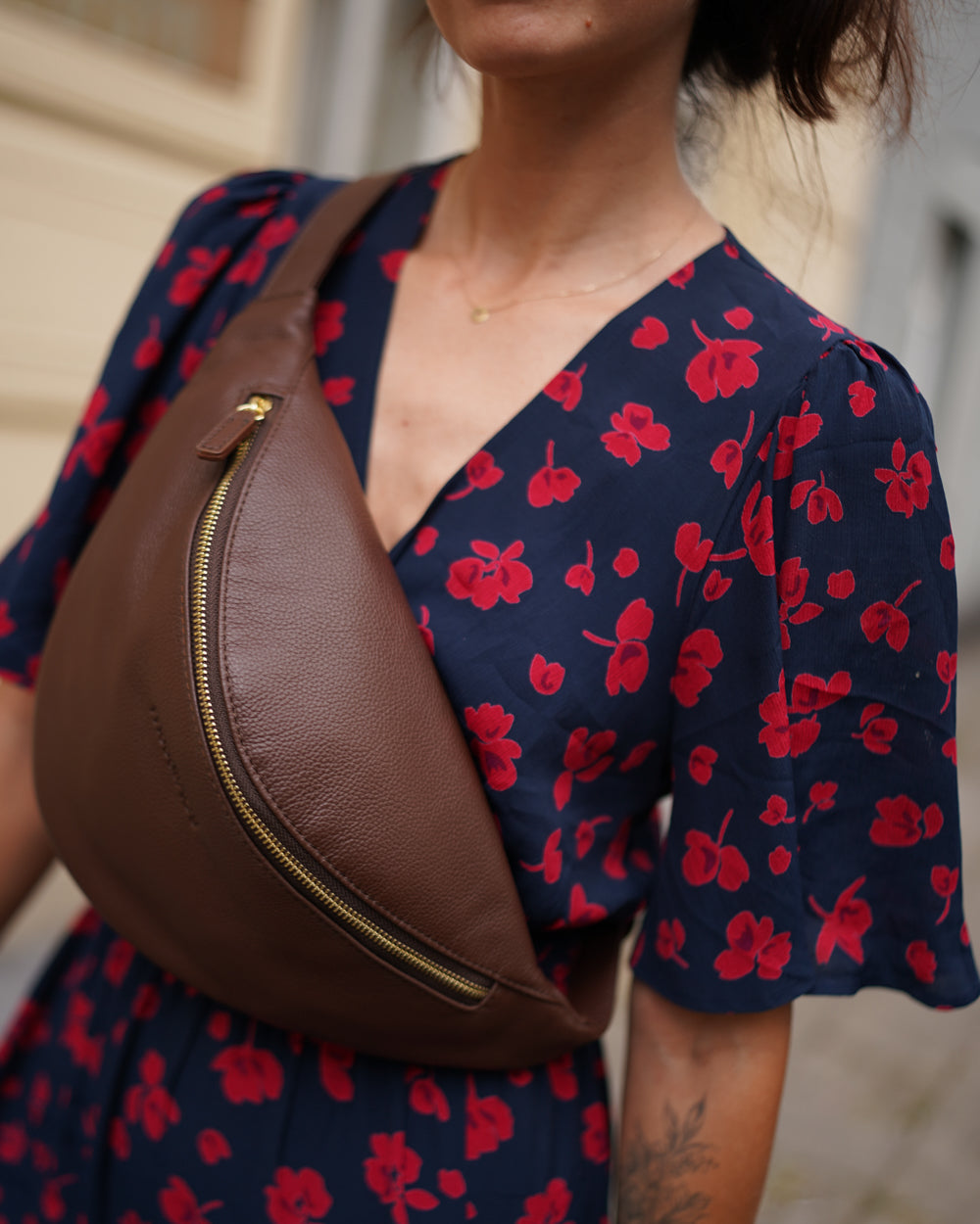 Posiada 2 kieszenie na zamek. Można nosić ją na kilka sposobów - przez ciało, tzw. cross body, na biodrach, w pasie, na ramię, a także na plecach. Okucia w kolorze jasnego złota idealnie współgrają z odcieniem skóry. Wewnątrz znajduje się nasza autorska podszewka w kwiaty i logo. Pasek jest wygodny, nie wbija się w ciało, regulowany na klamrę.