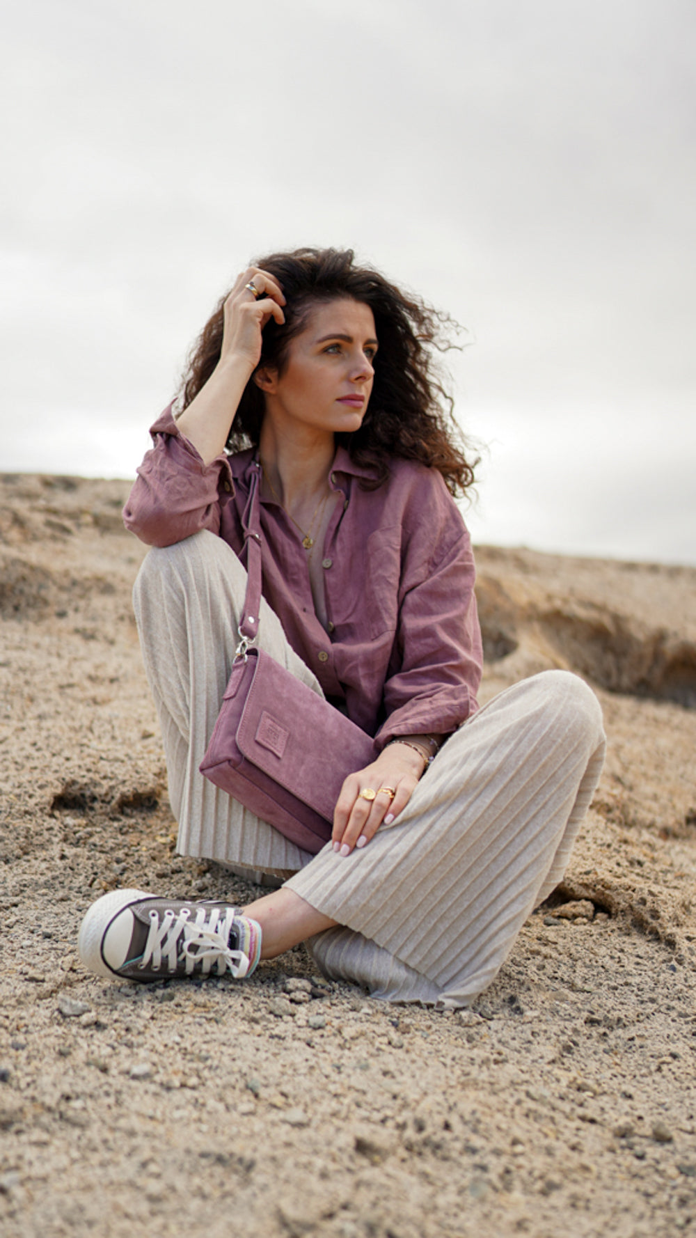 Bezpieczne użytkowanie: unikaj kontaktu z wodą i tłustymi substancjami. Nie pierz zamszowych produktów w pralce, nie czyść chemicznie ani nie stosuj preparatów do skór licowych – mogą uszkodzić strukturę zamszu. Chroń produkt przed ostrymi i chropowatymi powierzchniami, nie przygniataj go.