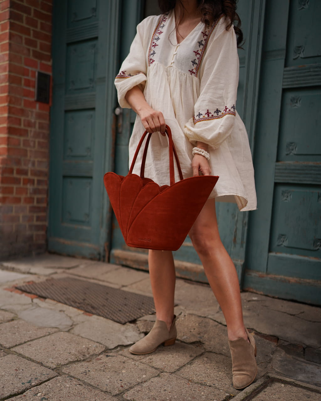 Używaj miękkiej ściereczki lub szczoteczki i dedykowanego impregnatu do skór naturalnych. Unikaj kontaktu z wodą i nadmiernej ekspozycji słonecznej.